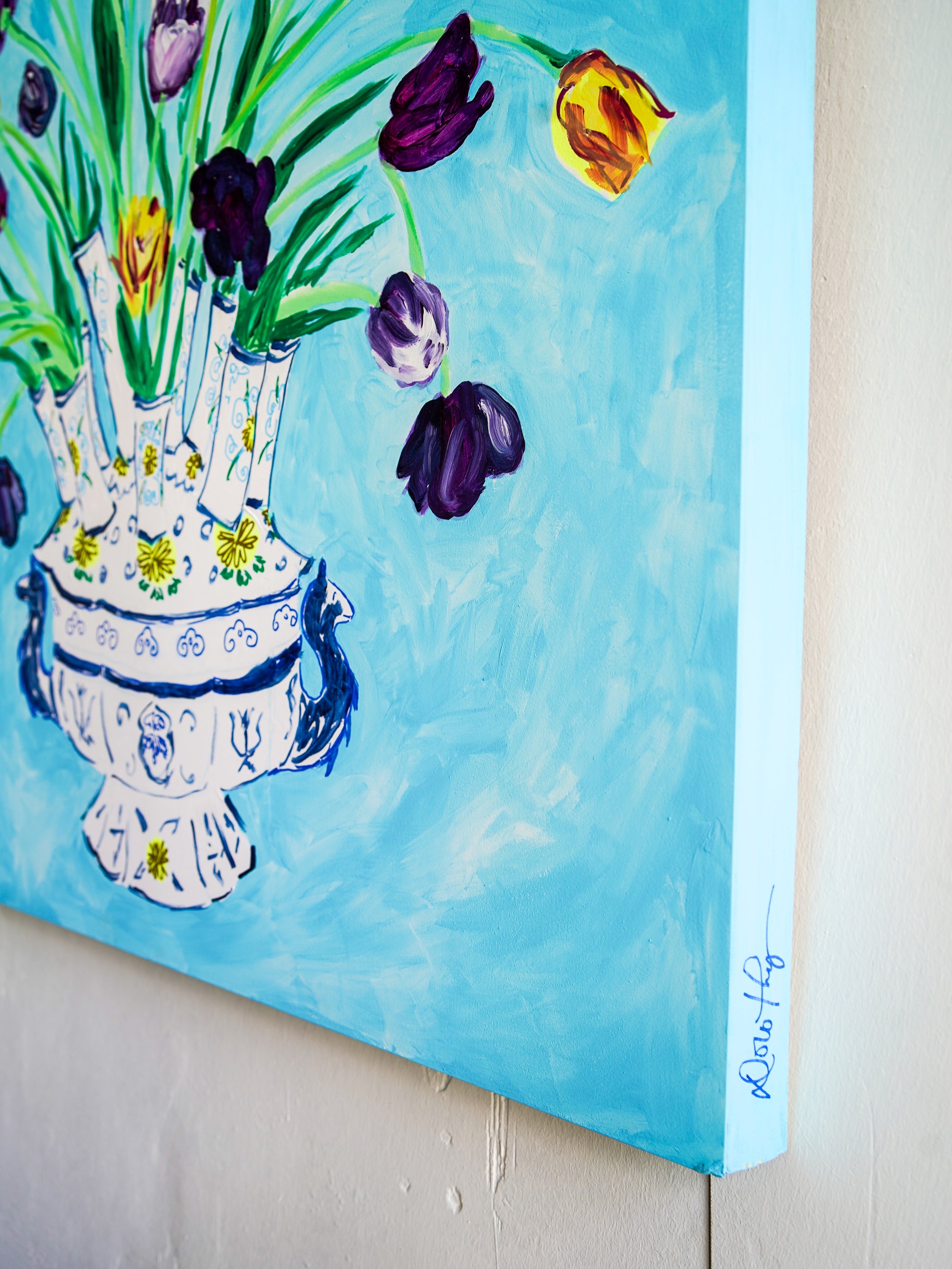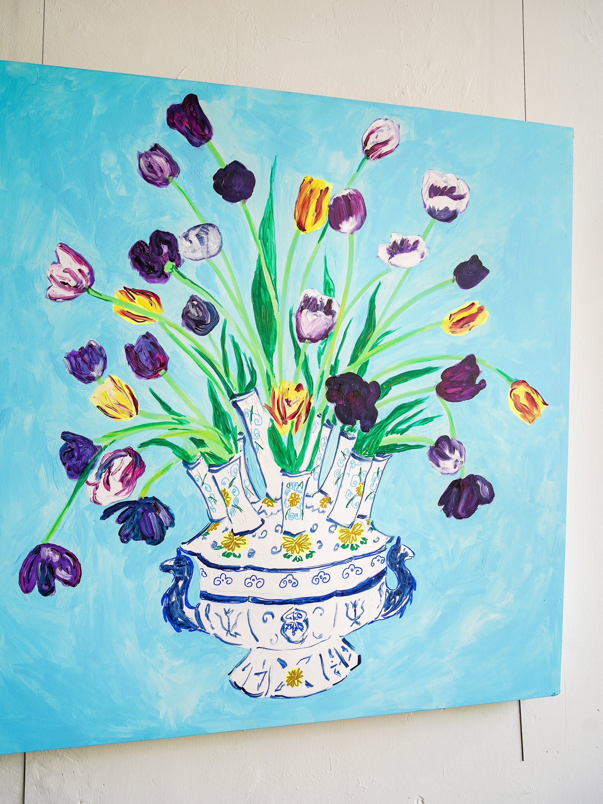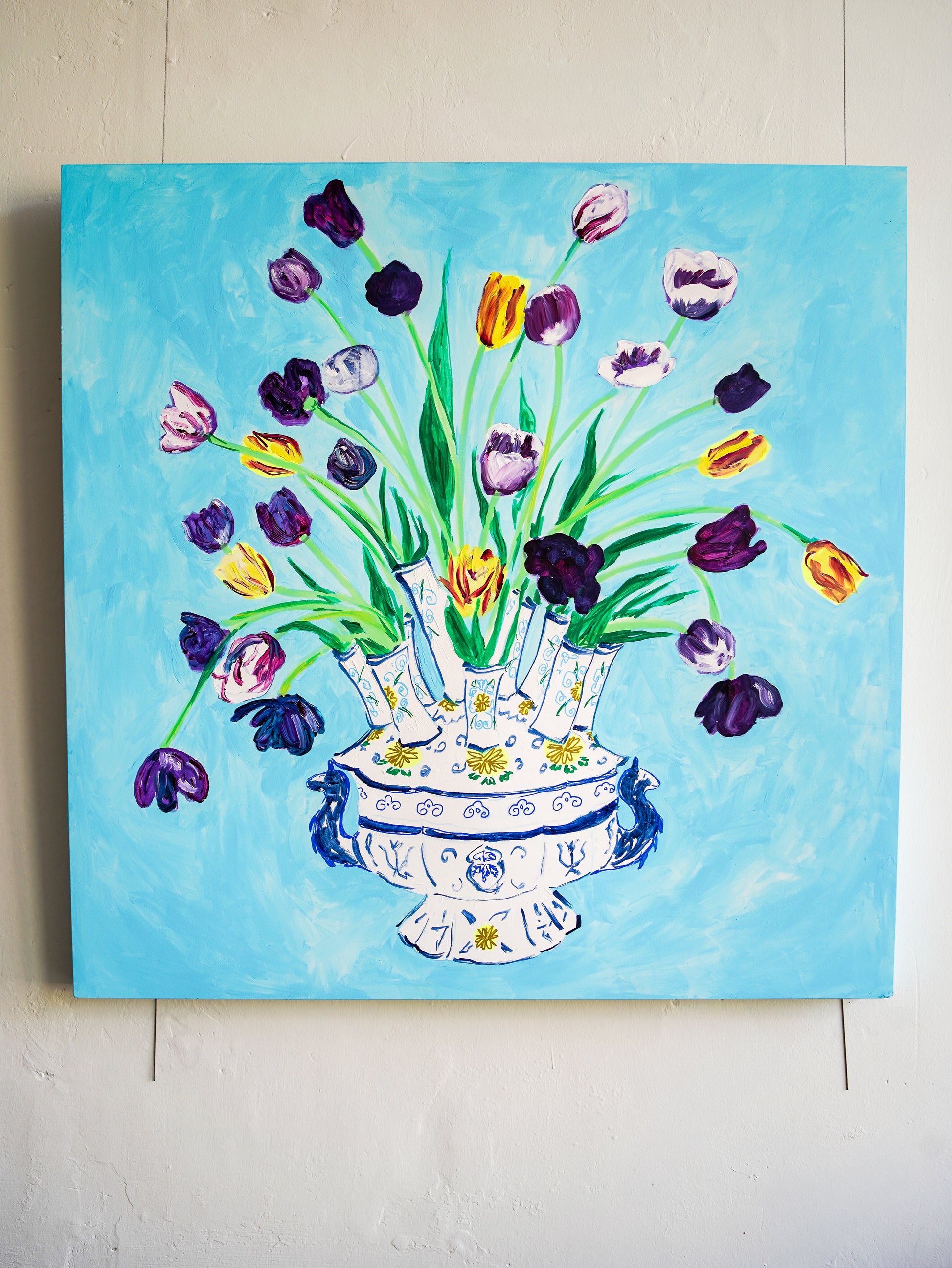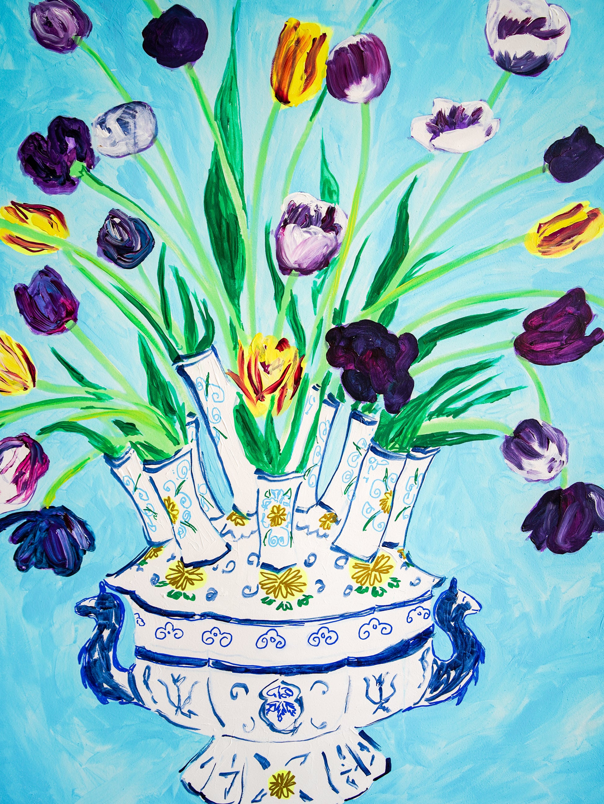 This vibrant painting showcases a bouquet of tulips in a decorative vase, rendered with lively brushstrokes and bold colors. The blue background perfectly complements the multicolored flowers, creating a cheerful and artistic ambiance suitable for any modern space.