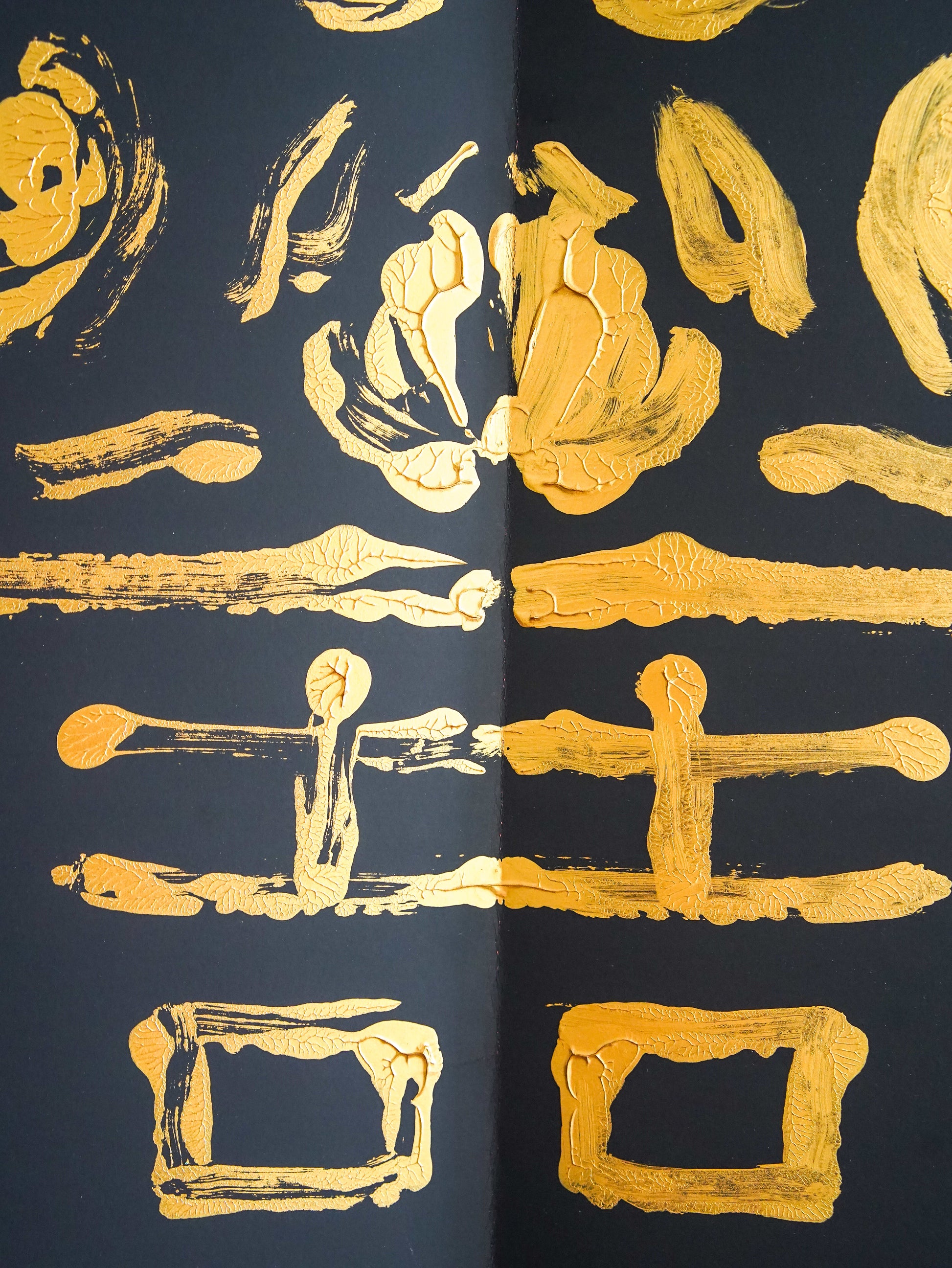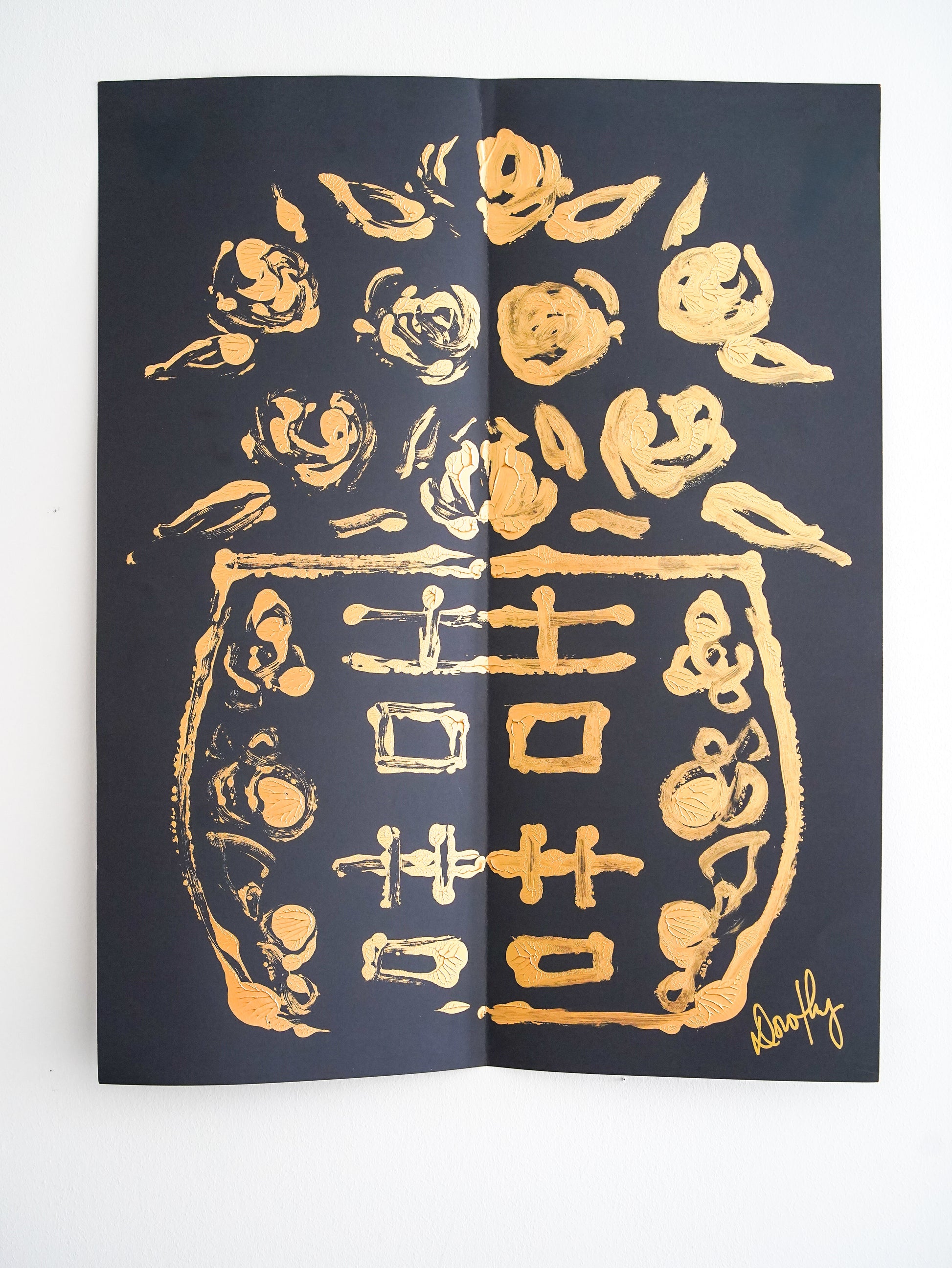 This art piece features an abstract floral design in gold on a black background. The bold metallic accents create a striking contrast, making it a captivating decorative piece for modern interiors. Its minimalist style adds a touch of elegance and sophistication to any wall.