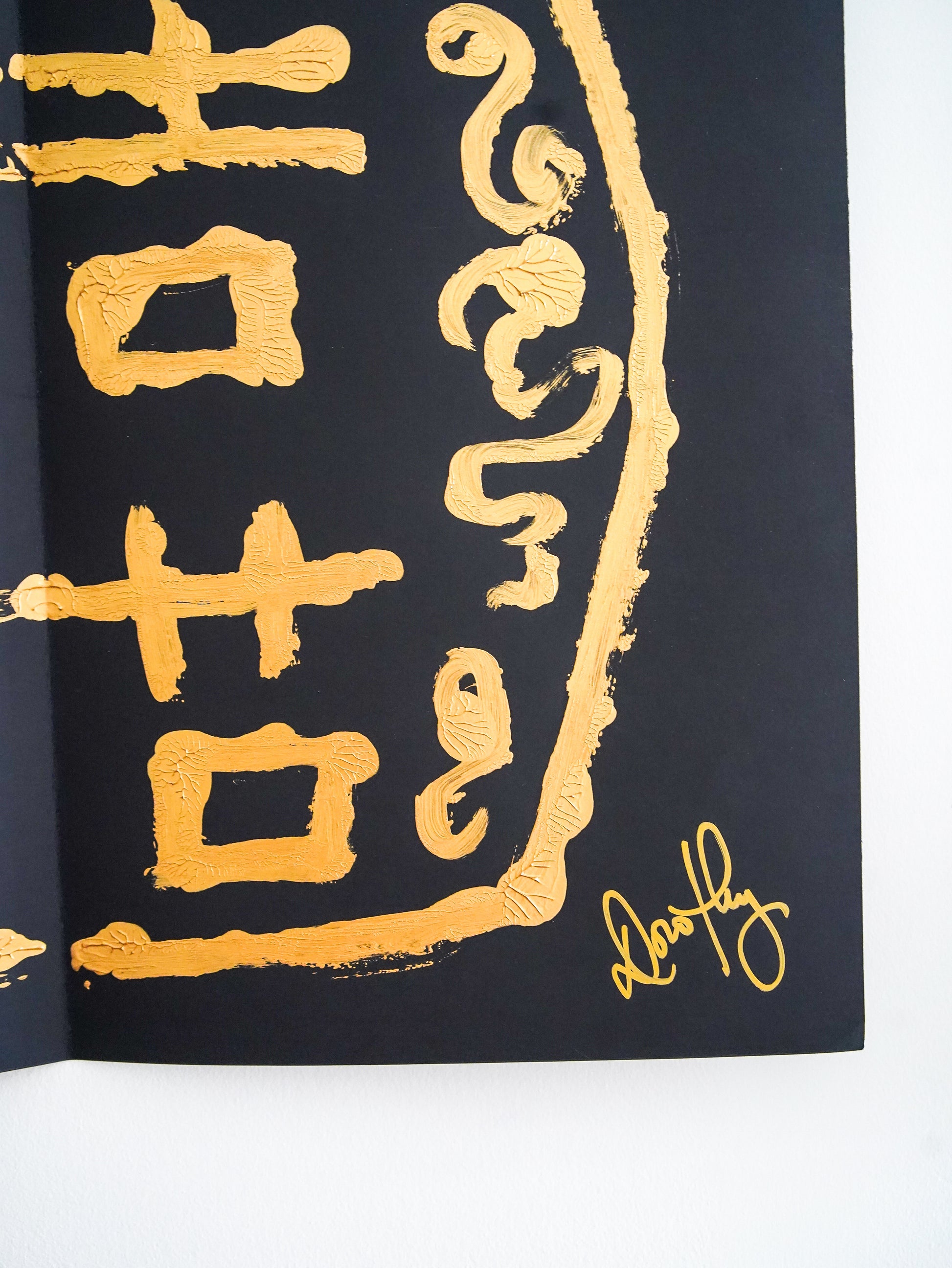 This striking piece of wall art features a black background with intricate gold designs, creating a dramatic and elegant focal point. Its abstract and ornate patterns make it perfect for adding a touch of sophistication to any space. The use of gold paint against the dark backdrop enhances the visual impact, making it a versatile decor element for modern or classic interiors.